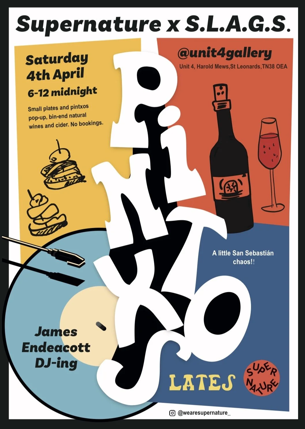 Small plates and Pintxos, natural wines and ciders and a full bar with our friends at Unit 4 Gallery. James Endeacott will provide the sublime soundtrack, no bookings just turn up for some for some San Sebastian-style chaos.